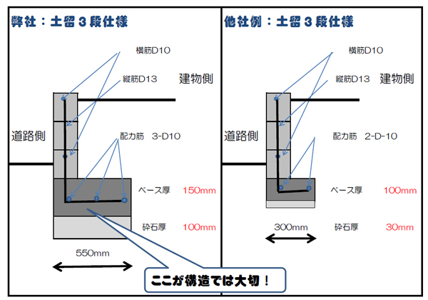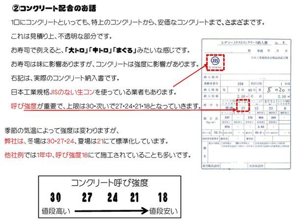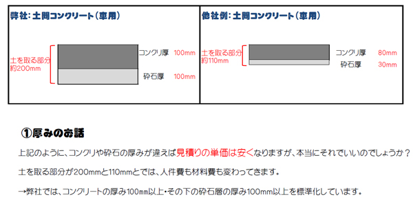 @ブロックや土間コンクリートでは、さきほどのようなコンクリートの厚みやコンクリート強度を下げることで、価格差を吸収している場合がある。